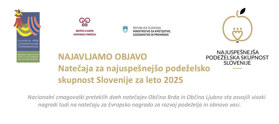 pozivajo podeželske skupnosti – vasi, skupine vasi, občine …, da se prijavijo na natečaj za Najuspešnejšo podeželsko skupnost Slovenije 2025 z motom »Vsi različni. Vsi povezani.« ter tako Sloveniji in Evropi pokažejo kako oblikujejo svojo prihodnost.